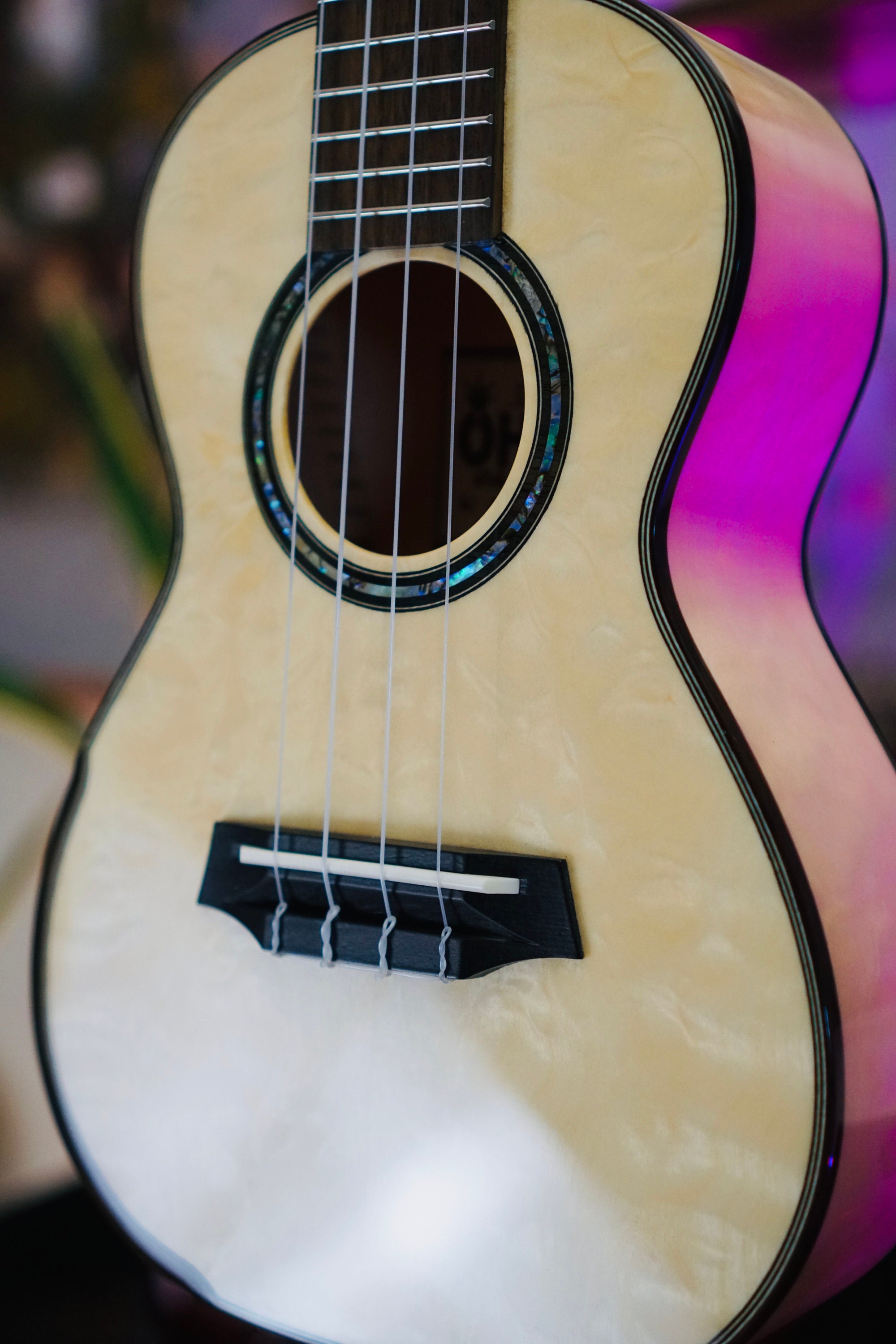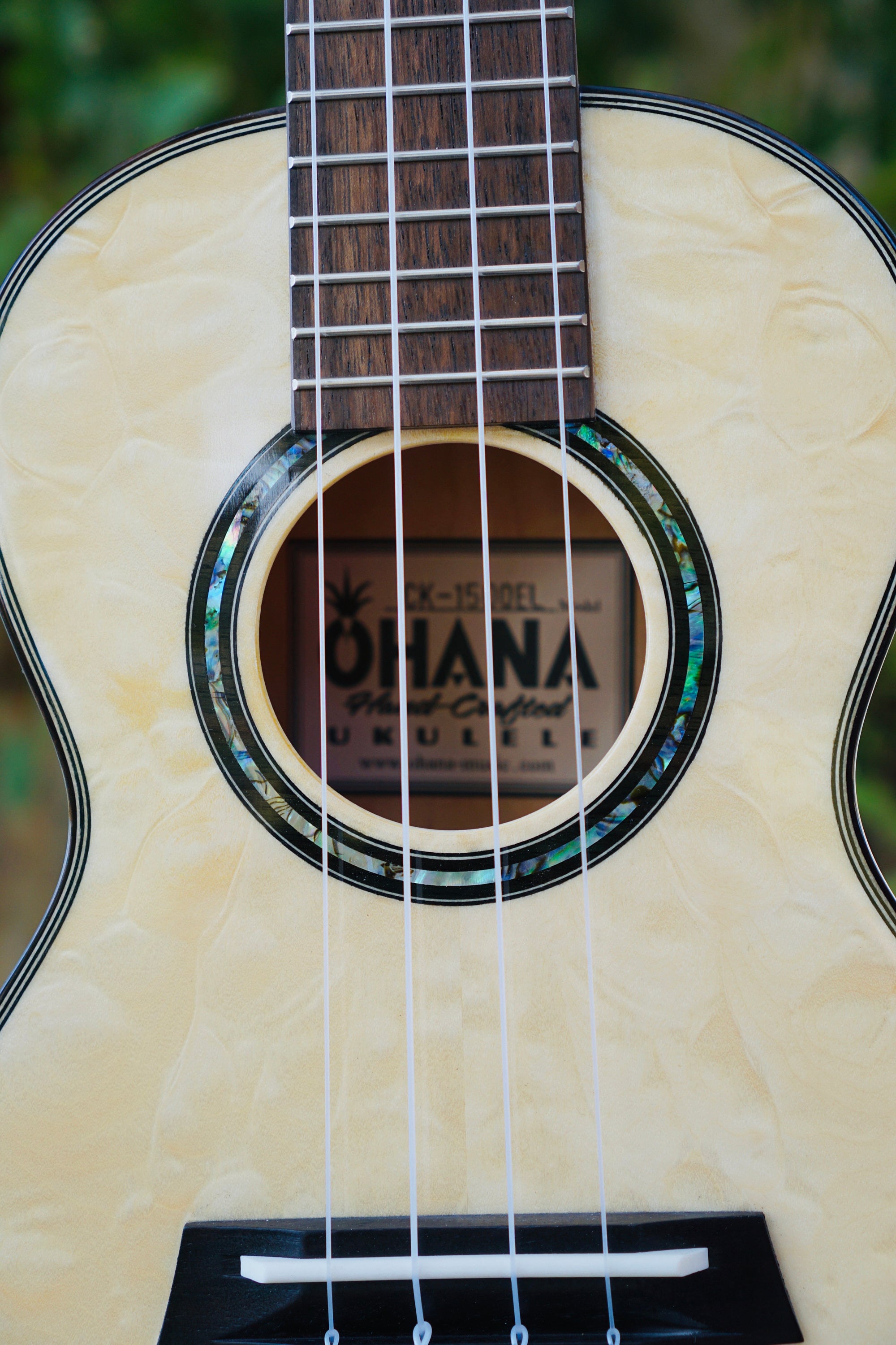 A wood and abalone inlay completes the rosette for this model— a perfect pairing for the gold and platinum hues of the eucalyptus.