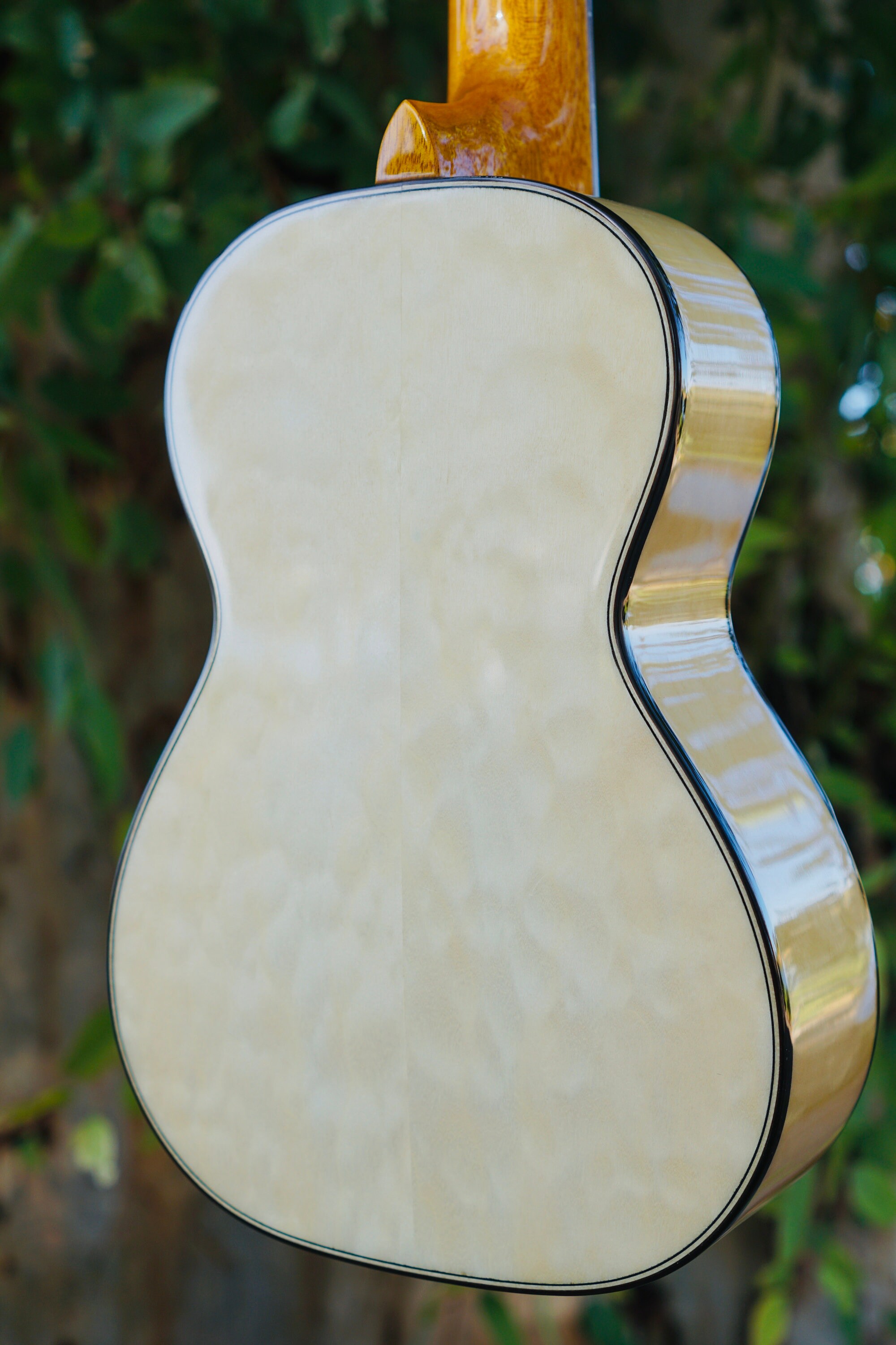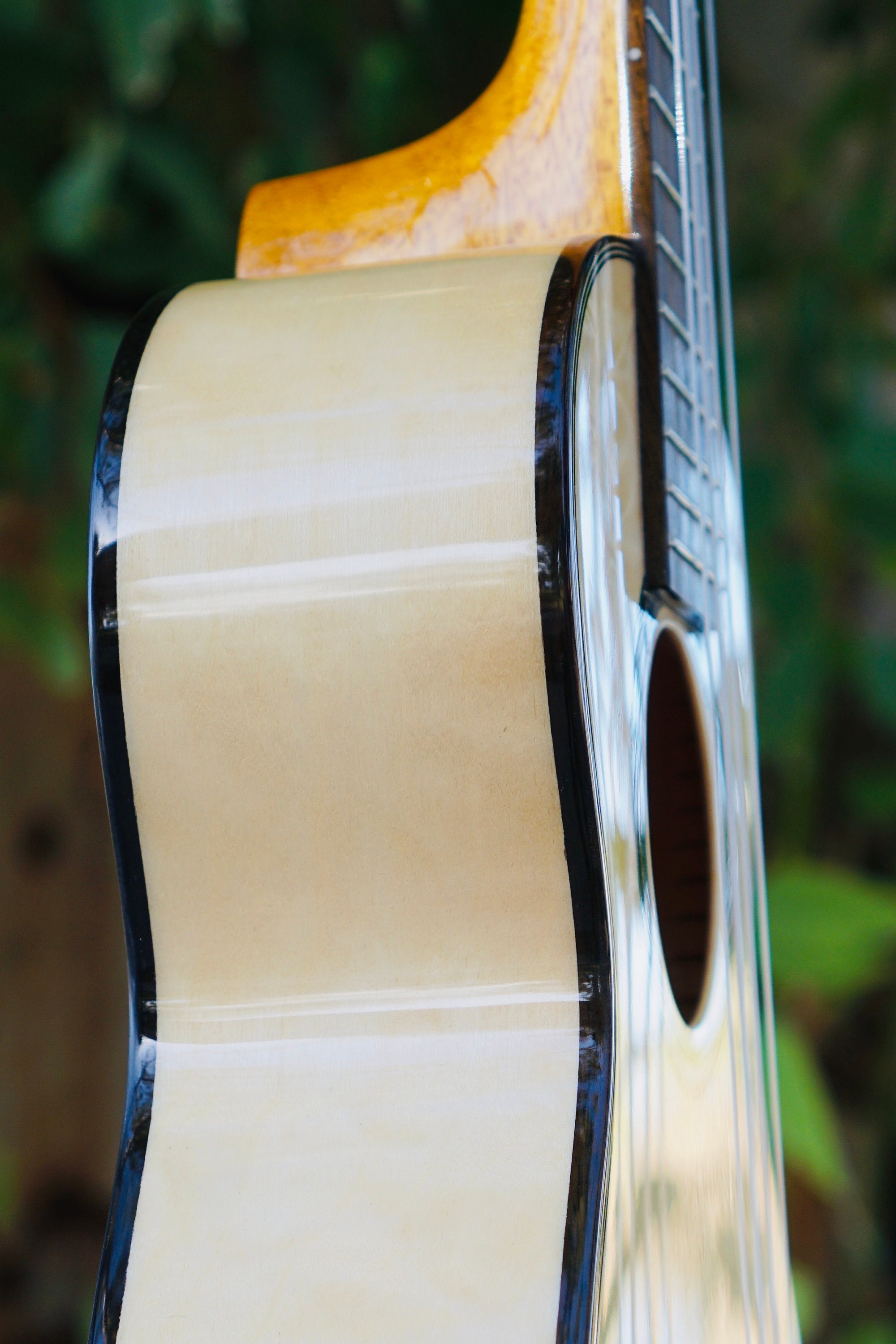 We’ve carried over the dark hardwood binding, with a simpler black/white purfling and faux comfort edge.